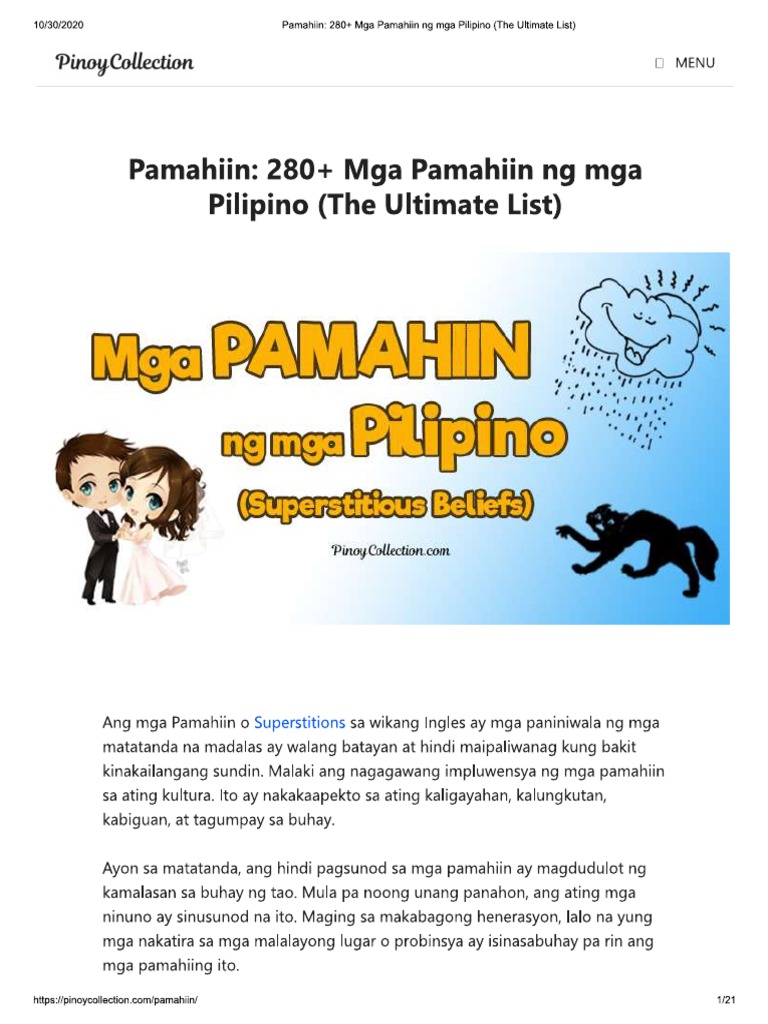 May silbi ang antanda tuwing dumaraan sa harap ng simbahan at pag-tabi po sa ilang lugar Ang pamahiin ay isang walang basehang paniniwala hinggil sa mga bagay-bagay na wala namang relasyon sa isat isa. 37 Full PDFs related to this paper. Ayon kay Jovina 2013 isang Filipino blogger ang mga sinaunang Filipino ay tulad ng mga tao.