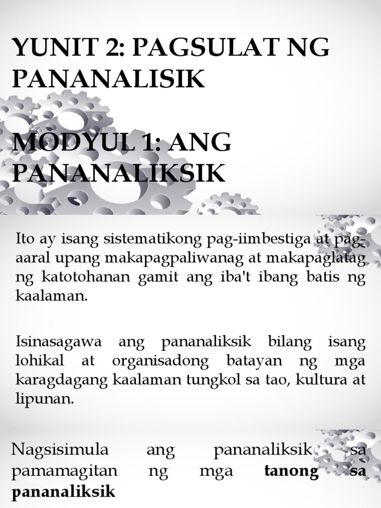 PANANALIKSIK Ayon kay Good 1963 ang pananaliksik ay isang maingat kritikal disiplinadong inquiry o pagtatanong sa pamamagitan ng ibat ibang teknik at paraan batay sa kalikasan at kalagayan ng natukoy na suliranin tungo sa klaripikasyon ato resolusyon nito. 6 n g P a n a n a l i k s i k Diseny o Matutukoy nang malinaw ang suliranin ng pananaliksik at mapangangatuwiran ang pagkaka pili nito. Ayon kay ang pananaliksik ay isang proseso ng pangangalap ng mga datos na kailangan upang malutas ang isang partikular na suliranin.