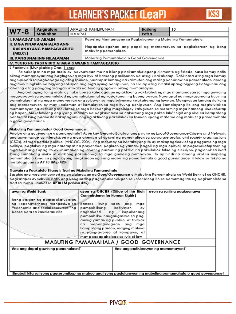 Tsart ng Mabuting Pamamahala Basahin ang mga sumusunod na paglalarawan ng Good Governance o Mabuting Pamamahala ng World Bank at ng OHCHR pagkatapos ay subukin natin ang iyong sariling pagpapakahulugan sa konseptong ito sa pamamagitan ng pagkompleto sa tsart sa. Halaw sa teksto na matatagpuan sa AP 10 LM p420 Gawain sa Pagkatuto Bilang I. 978-971-9990-80-2 Paunawa hinggil sa karapatang-sipi.